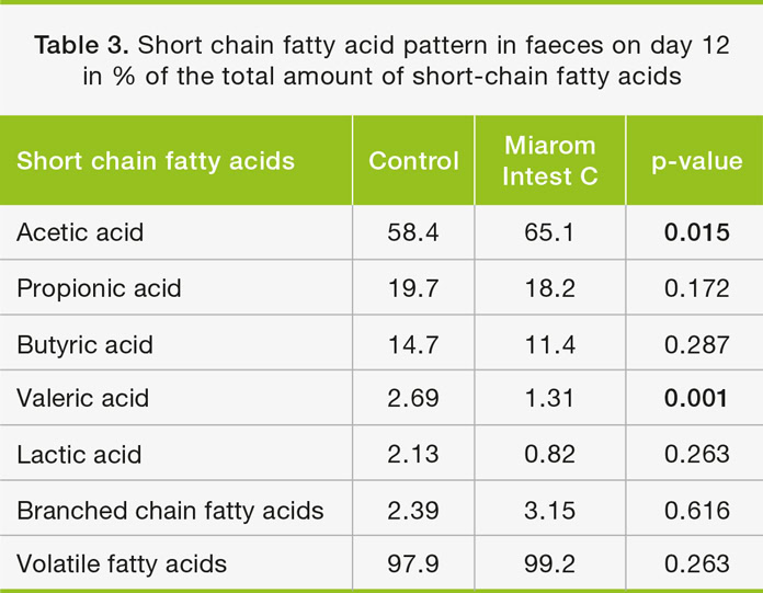 The relative amount of acetic acid was significantly higher and that of valeric acid significantly lower in the supplemented group (Table 3). The increase in acetic acid is reflected in lower amounts of other acids (not significant). The reduction in valeric acid in the supplemented group could indicate less protein fermentation in the large intestine and thus improved protein digestibility (Rasmussen et al. 1988). In combination, these results indicate a positive influence on the fermentation process. However, the exact mode of action of this semi-coated phytogenic product could not be proven by the experimental approach used. Further findings on microscopic changes of the intestinal mucosa, digestibility and long-term effects might help to clarify this question.