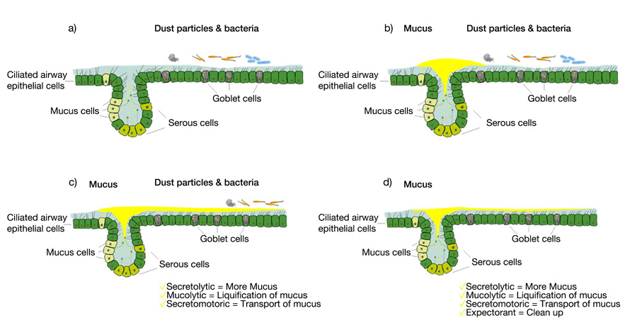 Performance requires oxygen – if the animals cannot breathe, they cannot perform. Healthy lungs create an important barrier between the environment and the animal. The respiratory epithelium in the airways is covered by moving cilia that sweep foreign particles away, while mucus secreted by goblet cells keeps epithelial moisture and traps particles and pathogens (Figure 1).