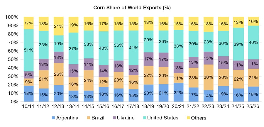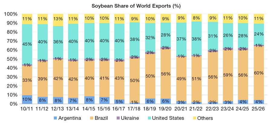 From a global trade flow standpoint, over the past decade, the United States has lost global export market share to South America. With a potential record soybean crop being planted in Brazil and increased US domestic consumption of soybean oil for biodiesel, South America will likely continue to be the critical supply source for global food next year. However, if there is a weather event in South America in 2026, this trend may be upended, as the US will be one of the few sources with ample stocks from 2025.