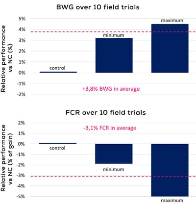 Numerous field trials have proven and quantified the positive effects of this new technology on poultry performance and profitability in modern poultry meat production. Several trials, in Asia, Europe and North America, have showed a significant increase of performance. In some recent trials performed in Europe, it has been tested at 400 g/ton of feed in broilers. The technology triggered a better growth due to better intestinal health (BWG +3.8 % on average), a better feed conversion ratio (FCR -3.1 % on average), but also less enteric problems, better control of Gram+ and Gram- bacteria (coli bacteriosis, clostridium, salmonella etc.). Additionally, the product increased dry-matter content of feces resulting in dry litter, and consequently in lower occurrence of footpad dermatosis, and finally a reduction of ammonia.