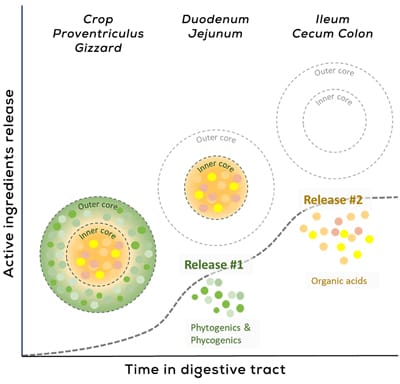 The double-encapsulation technology, based on a unique formulation of phytogenics, phycogenics and organic acids, offers an opportunity to support gut health of animals and trigger more consistent performance, especially in adverse conditions, thanks to its unique ‘sequenced release’ of ingredients in the intestinal tract.