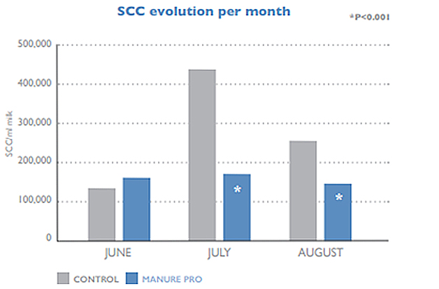 The increase in SCC seen in the control pens was not observed in MANURE PRO pens, meaning that MANURE PRO – through maintenance of the bedding microbial quality – significantly helped keep a low SCC level in milk during the summer months.