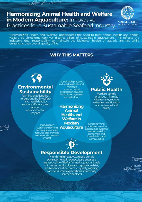 “Harmonizing Animal Health and Welfare in Modern Aquaculture” examines how the adoption of welfare-enhancing technologies and practices are beneficial to animals and producers alike. Evidence shows that treating welfare as more than a formality not only ensures a higher quality of life for farmed aquatic animals, it also minimizes product loss and reputational risk, and enhances final product quality to align with consumer expectations for ethically sourced seafood. In addition, welfare-centric practices decrease public health and disease risks, reduce reliance on antibiotics, and enhance food safety. Further findings conclude that farming practices that foreground both welfare and health lead to resource efficiency and reduced environmental impact.