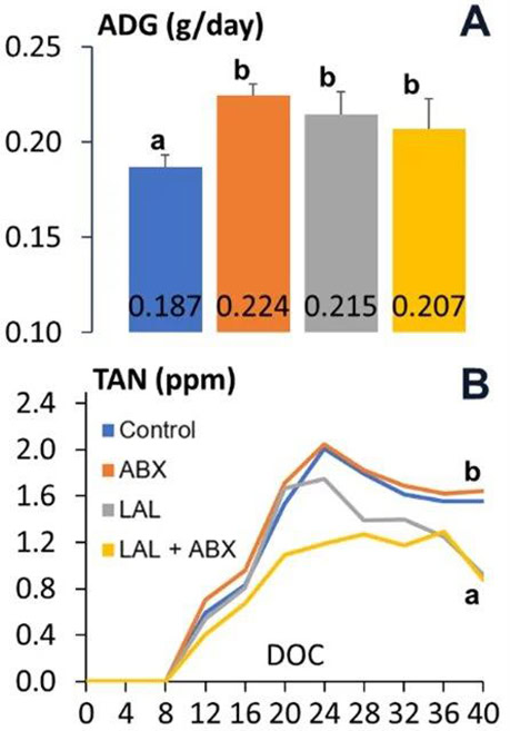 The 42-day grow-out trial was performed in Vietnam using whiteleg shrimp juveniles reared at high density in outdoor tanks with low water exchange under commercial-like conditions. Four treatments were applied: a control group, an antibiotic group (ABX), a Lallemand group (LAL – LALPACK Probio and LALPACK Immune supplementation in the feed and LALSEA Biorem in pond water), and a combined antibiotic + Lallemand group (LAL+ABX).