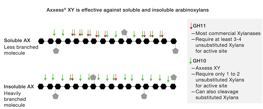 The GH10 xylanase requires only two consecutive unsubstituted xylan monomers to cleave the xylan main chain, whereas a GH11 xylanase requires 3 or 4 consecutive unsubstituted xylan monomers. Therefore, the number of potential AXOS and XOS oligomers is higher from the action of the GH10 xylanase. This results in a wider range of oligomers, quite valuable as the effect is spread across the large intestine, each oligomer having a different fermentation rate. Consequently, the colon microbial activity becomes saccharolytic, which potentially reduces the undesirable products of proteolytic degradation, such as phenols and cresols.
