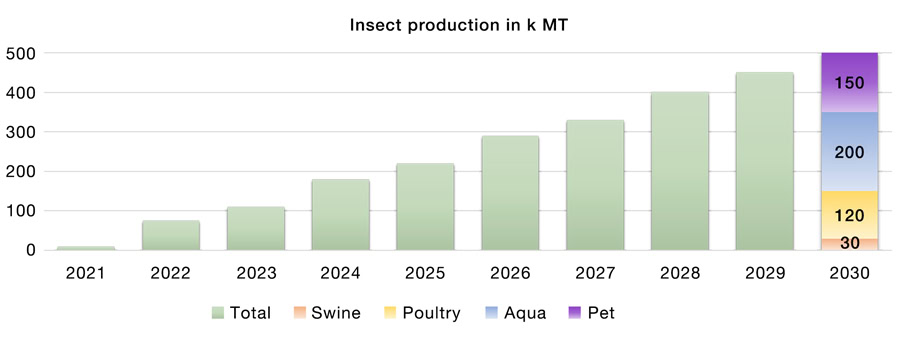 As per Rabobank’s research of 2021, see Figure 1, the global volume of insect ingredients incorporated in feed and pet food is expected to grow up to 500K MT by 2030, predicting pet food to be the second largest market.13