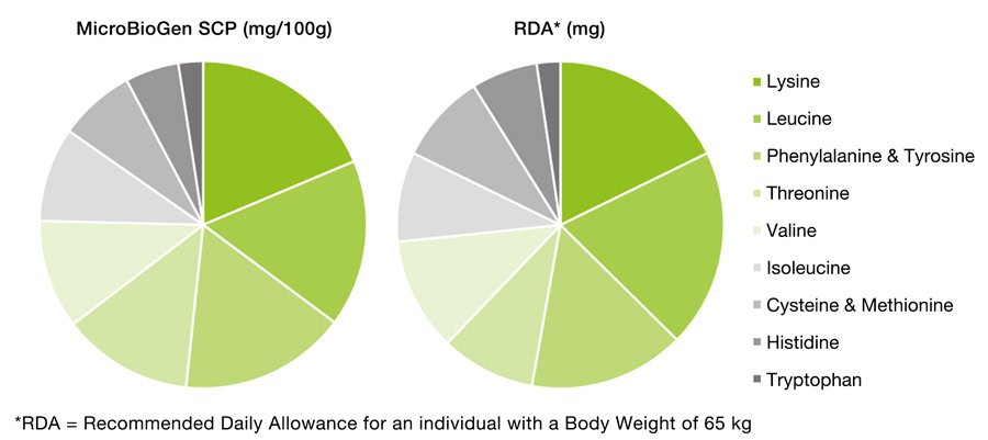 One of the main challenges in finding an alternative protein source for aquafeed is matching – or surpassing – the nutritional quality of fish meal which contains around 65% protein and a balanced amino acid profile. MicroBioGen, uniquely capable of improving yeast using non-GM technology, has developed a yeast single-cell protein (SCP) to address this challenge. Whereas typical baker’s yeast consists of only about 45% protein, MicroBioGen’s yeast contains up to 60% protein, while the amino acid profile of MicroBioGen’s SCP aligns well with the recommended daily allowance of essential amino acids for both humans and animals (Figure 2).