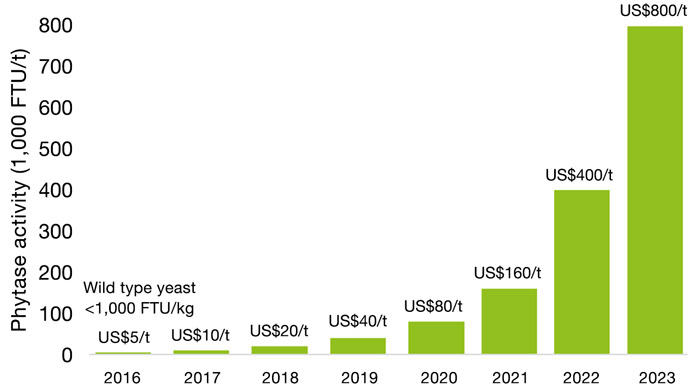 Vegetable proteins are commonly incorporated into animal feed. Soy meal, the greatest single source of vegetable protein used for animal feed, has an annual production of approximately 400 million tonnes. While soy meal is rich in protein, anti-nutritionals such as phytic acid interfere with nutrient absorption, particularly in monogastric animals. To counter this, producers often add exogenous phytase enzymes to the feed to decompose phytic acid. MicroBioGen has created a special non-GM yeast that produces over 500 times more phytase than normal yeast. Using just 1 to 2 kg of MicroBioGen’s high phytase yeast per tonne of vegetable meal can efficiently neutralise all the phytic acid present. This enhancement could raise the value of each tonne of SCP made from industrial waste by up to US$800.