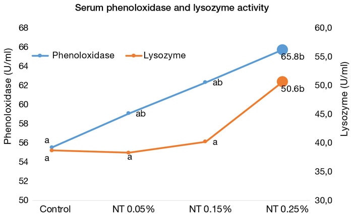 Because invertebrates, such as shrimp, lack an adaptive immune system, they depend entirely on innate immunity for pathogen defense (Xiong et al., 2018). Nucleotide supplementation effectively activates this non‑specific immune defenses, significantly increasing serum activities of phenoloxidase (PO) and lysozyme (Xiong et al., 2018) (See Figure 2). By upregulating immune‑related genes, nucleotides markedly enhance disease resistance and survival in both shrimp and fish during severe pathogenic challenges (Xiong et al., 2018; Shiau et al., 2015; Burrells et al., 2001).