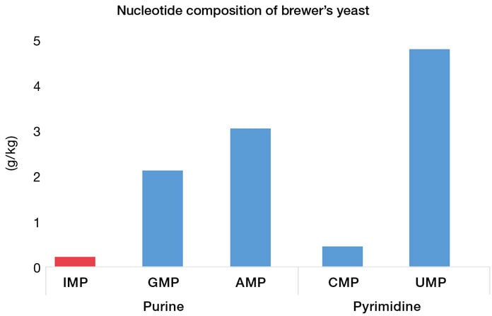 Beyond absorption rates, the “Profile Balance” is equally important. Figure 3 illustrates this imbalance; it shows that Brewers Yeast contains disproportionately low levels of IMP, while other pyrimidines dominate the profile. Purified IMP, however, provides a consistent and high-potency supply that ensures efficient salvage pathway activation through direct nucleoside supply. For producers looking for reproducible results and maximal growth, choosing a purified form is a more reliable way to bridge the nutritional gap and achieve superior performance.