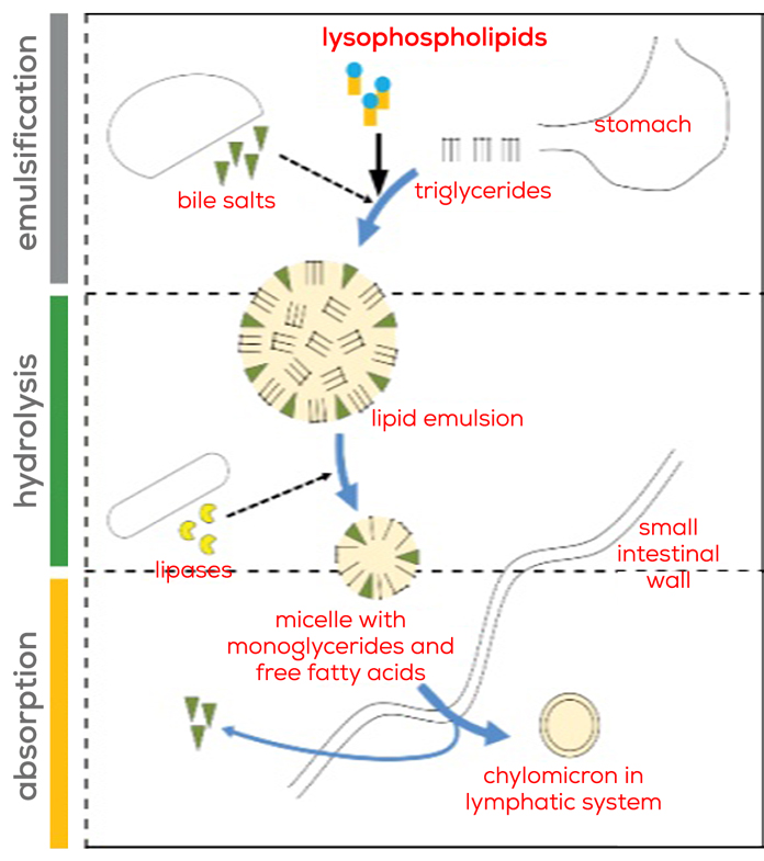 – Firstly, during emulsification, fat is emulsified into little droplets by bile acids with both hydrophilic and hydrophobic groups, which help to enlarge the contact surface between fat and lipase.