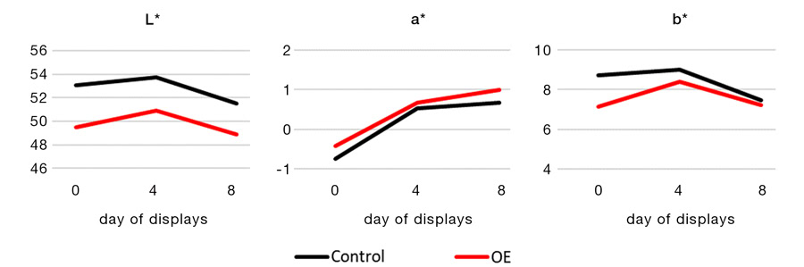 (L*, lightness; a*: redness; b*: yellowness; OE: Olive bioactives)