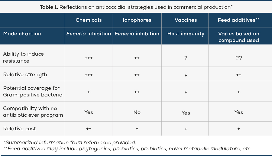 Another strategy to improve drug sensitivity has been to switch from anticoccidial drugs to using a coccidia vaccine. Coccidia vaccines are based on specific Eimeria species and induce immunity three to four weeks after vaccination (Tewari and Maharana, 2011). Introducing non-resistant Eimeria via vaccination can repopulate the environment to restore drug sensitivity. However, the effectiveness of this strategy to restore environmental Eimeria drug sensitivity may be impacted by litter management strategies (i.e., raising birds on fresh litter for each cycle or using re-used litter for several cycles). One challenge with coccidia vaccines is that they tend to impact performance during the time the birds are acquiring immunity. This associated performance loss is more challenging to overcome when birds are marketed at a younger age compared to those marketed at an older age because there is limited time to regain that lost performance. Recovering performance loss associated with vaccination is one area in which feed additives can be used as part of a coccidiosis management strategy.