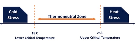 Feed intake will likely be reduced in hot weather, so the diet should be concentrated to contain adequate energy and nutrients to compensate for lower intake levels. A higher level of fat in the diet will concentrate the energy source, vitamins and minerals must be scaled up accordingly. Fat is one of the more easily digestible dietary components and generates less metabolic heat during digestion compared to starches and protein.