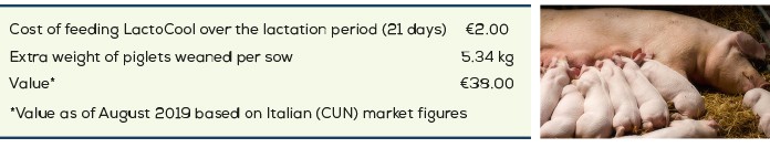 Research conducted by the Italian veterinary research practice, SuiVet in conjunction with the University of Parma investigated the effects of including LactoCool in the diets of lactating sows in Italian summer conditions. The control group was fed the standard farm mixed farrowing ration. The treatment group was fed the same ration with the addition of 3kg/ton of LactoCool, which lead to a significant increase (<0.001) in the piglet daily live weight gain and trending towards reducing preweaning mortality.