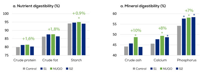 Researchers have observed that the new concept not only improved digestibility of nutrients (crude fat, crude protein and starch) but also increased digestibility of minerals (crude ash, calcium and phosphorus) as compared to the negative control (Figure 1). The other two solutions (S1 & S2) improved digestibility of some of the nutrients and/or minerals but not all and to a lower extend than the new concept.