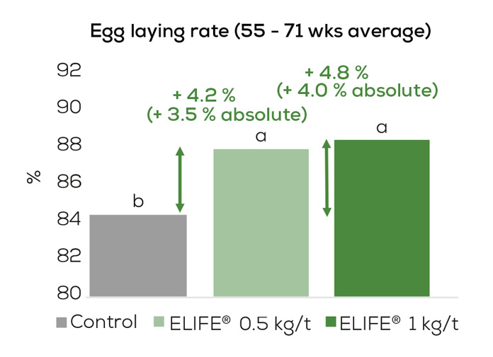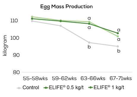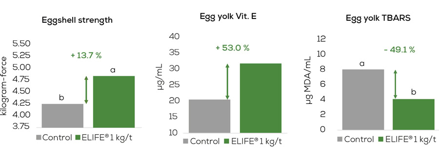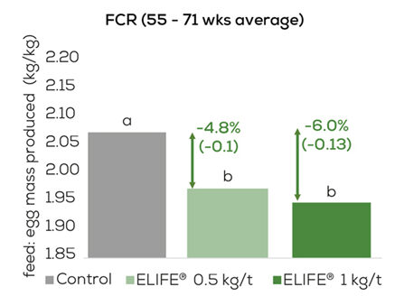 Moreover, the balanced polyphenolic mixture enabled a more efficient egg production during phase 2 of lay, by reducing the feed conversion ratio. Over the entire trial, hens from the 0.5 and 1 kg/t ELIFE® treatment groups showed a significant (p < 0.05) reduction of resp. 10 and 13 points versus hens from the control (Figure 3). All this, presumably, by strongly alleviating the level of cellular oxidative stress and thus body tissue damage within these high-performing hens (i.e. fewer nutrient losses).
