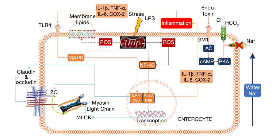 TLR4: toll -like receptor 4; NF-kB: Nuclear Factor kappa-light-chain-enhancer of activated B cells pathway; MAPK: Mitogen Activated Protein Kinase pathway; ERK, Rel A: nucleus-translocated components of pathways modifying protein transcription; MLCK: Myosin Light Chain Kinase; ROS: Reactive Oxygen Species; IL-1b, TNF-a, IL-6, COX-2: pro-inflammatory cytokines; GM1: ganglioside receptor of ETEC LT toxin; LPS: bacterial lipopolysaccharide.