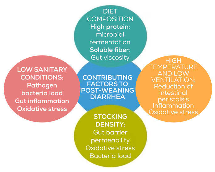 Post-weaning diarrhea is considered one of the main disorders contributing to the use of antibiotics and therapeutic levels of zinc oxide (ZnO) in pig production. The use of antibiotics and medical levels of ZnO in pig production has a detrimental impact on both human health and the environment. Moreover, factors other than pathogens (such as husbandry practices as described above) can also lead to diarrhea which indicates that antibiotics are not always the most appropriate solution for treating diarrhea in piglets. Thus, adopting better husbandry practices and administering dedicated nutritional solutions via the piglet feed should be considered to support the healthy functioning of the gut so as to avoid gut disturbances such as piglet diarrhea.
