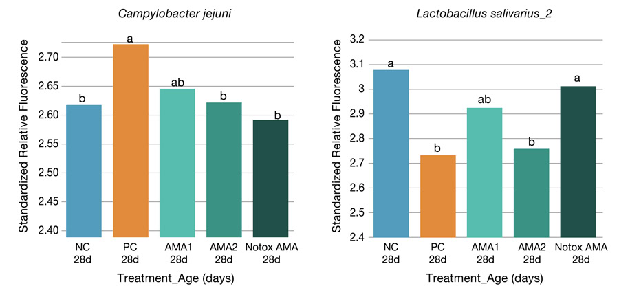 Importantly, we identified a positive correlation between an AMA’s effect on microbiota composition and its impact on bird performance, suggesting that microbiota protection represents a key mechanism through which AMAs mitigate mycotoxicosis. Of the AMAs tested, the most beneficial, Notox™ AMA, successfully reduced the prevalence of harmful bacterial groups that proliferate under mycotoxin challenge while supporting the recovery of beneficial bacterial populations that typically decline with mycotoxin exposure. These findings highlight the importance of selecting scientifically validated AMAs that have demonstrated specific efficacy against the mycotoxins present in a given production system.
