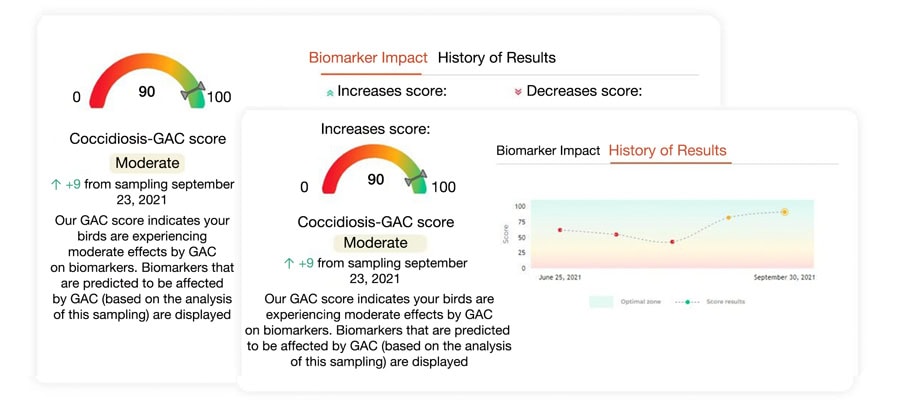 This principle was applied in practice on a farm in the US. Blood samples were taken from birds on four different farms on day 14. The blood analysis results were used to predict that two of the farms would have a coccidiosis outbreak later, and the other two would not. A second visit to the farms on day 28 confirmed the predictions.