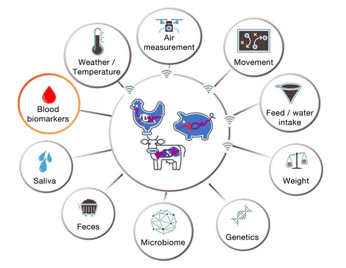 Verax™ is part of a wider precision animal farming platform. Blood biomarkers are only one source of input, but data can be gathered from a whole range of biological matrices including saliva, digesta and excreta contents, feed and water consumption, and genetics (Figure 2).
