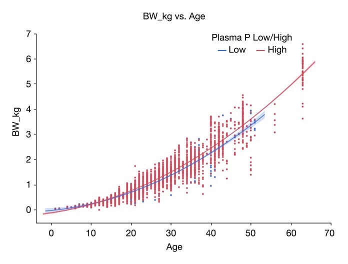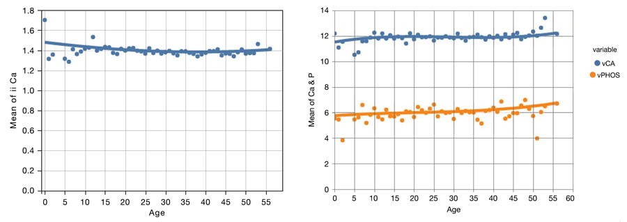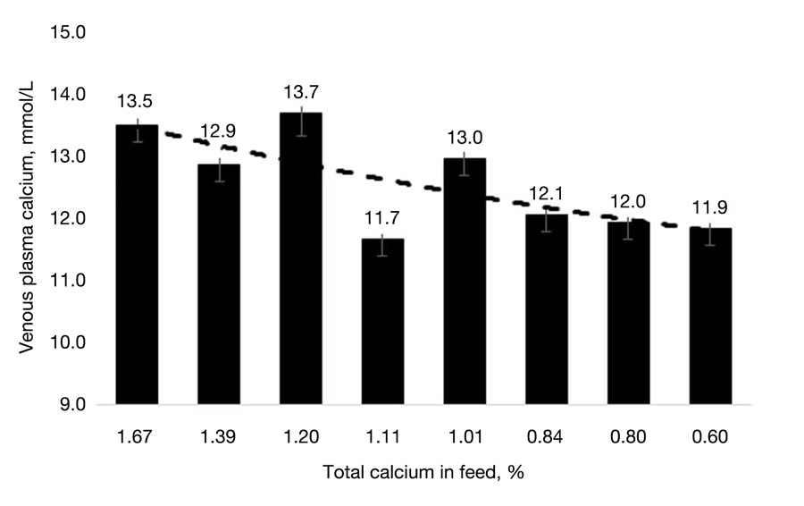 Total blood Ca is typically around 11.5-12 mg/dL, and P is usually approximately 6-7 mg/dL (Figure 5). Approximately 47-48% of blood Ca is ‘ionized’ (metabolically active; Figure 4), whereas the remainder of blood Ca is covalently bound to plasma proteins or associated with anions such as phosphate or lactate. These concentrations do not substantially change with bird age or gender but can be disrupted by various nutrition and management factors.