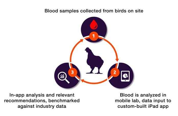 Figure 1 shows how data are gathered, collected, and interpreted in the Verax™ platform. First, blood samples are taken from birds and analyzed on site. The analysis results are added to the secure Verax™ cloud database via a dedicated app. The results are benchmarked, and the significance of the analysis results are given to the producer who can then make more informed management decisions. Over time, comparisons can be made to previous seasons or flocks, helping to identify changes. Using Verax™ is especially helpful when implementing new flock management changes or nutritional changes, as the data can be used to see how the changes are affecting the physiology of the bird.