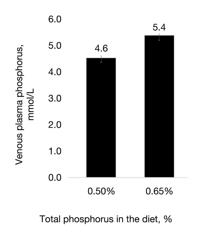 Even though Ca levels are hormonally regulated, blood Ca and P does respond to dietary inputs. Parathyroid hormone, calcitonin and vitamin D will regulate blood Ca levels to some extent, but not completely. Figure 6 shows a statistically significant association between dietary Ca and plasma Ca. This has also been shown for P (Figure 7). Interestingly, whilst dietary P has an influence on blood P, diet Ca is capable of influencing both Ca and P. Specifically, over-feeding dietary Ca has a supressing effect on blood P and vice versa. Whilst dietary Ca and P do have some influence on blood Ca and P, blood pH and acid/base balance may be more important in order to optimise blood Ca and P concentrations. For example, the proportion of total blood Ca that is metabolically active and can contribute to skeletal mineralisation is normally around 47-48% in broilers. However, this can drop by 2-4% for every 0.1 unit increase in blood pH. These interactions highlight the importance of monitoring biomarkers beyond blood Ca and P when attempting to optimise the nutrition and health status of the bird.