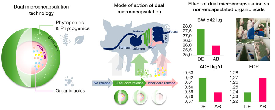 Dual microencapsulation represents a significant advancement in feed additive design, providing precision, consistency, and multifunctionality through the controlled, sequential release of bioactive compounds. By protecting sensitive molecules during feed processing and gastric passage, the technology ensures their targeted availability in specific regions of the gastrointestinal tract, where they can modulate microbiota, support digestive function, and enhance immune resilience. This stepwise delivery allows diverse functional compounds – such as antimicrobials, antioxidants, and immunomodulators – to act synergistically at appropriate intestinal sites, improving nutrient utilization, gut health, and growth performance while reducing the need for high-dose additives or pharmacological interventions. The approach also minimizes variability in outcomes, enables lower inclusion levels, and aligns with sustainable production goals by supporting animal welfare and reducing reliance on antibiotics or zinc oxide. Ongoing field applications and research demonstrate that dual microencapsulation provides a science-based, practical solution for optimizing post-weaning piglet nutrition, integrating performance, health, and sustainability in modern swine production.