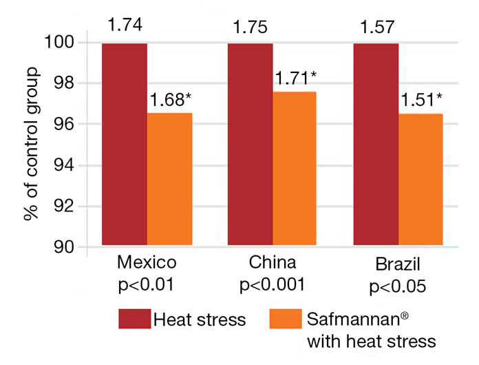 In addition to its positive effects on gut barrier preservation and Clostridium perfringens reduction, Safmannan® has also been shown to help mitigate the detrimental effects of heat stress on broiler productivity. Multiple trials conducted in different regions around the world have demonstrated Safmannan® capacity to improve feed conversion ratios (FCR) and survival rates in broilers under severe heat stress conditions (Figure 4).