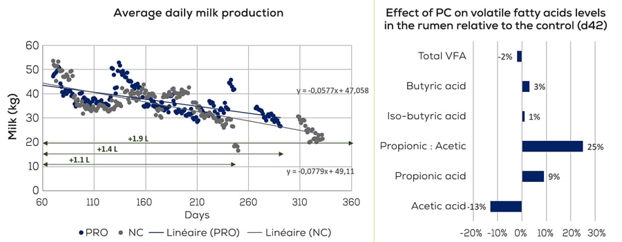 Interestingly, the cows from the PC group, which had a higher milk production than cows from control diet, also maintained their fat% and protein%, indicating no dilution of the milk. These results confirm the effects of PC treatment on protein metabolism and energy in the rumen. As an example, the PC treatment showed an effect on VFA production, with an increase of the ratio of propionic:acetic acid, which represents a gain of energy for the cows. This highlights the effect of the new product on ruminal microflora, to alleviate the fermentation pathways and optimize rumen efficiency.