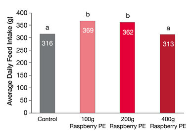 Piglets fed with Bigarol Raspberry P showed a significant increase in average daily feed intake and average daily gain compared to those which received the control diet. Specifically, treatment 2, which included 100 g of Bigarol Raspberry P per ton of feed, achieved the best enhancements in daily feed intake and average daily gain compared to the control, treatment 3 (200 g Bigarol Raspberry P per ton of feed), and treatment 4 (400 g Bigarol Raspberry P per ton of feed).