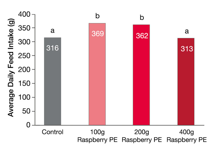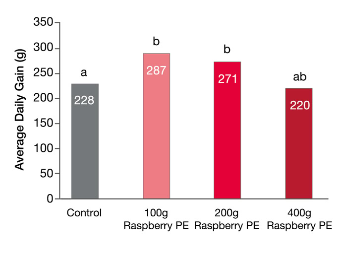 Piglets fed with Bigarol Raspberry P showed a significant increase in average daily feed intake and average daily gain compared to those which received the control diet. Specifically, treatment 2, which included 100 g of Bigarol Raspberry P per ton of feed, achieved the best enhancements in daily feed intake and average daily gain compared to the control, treatment 3 (200 g Bigarol Raspberry P per ton of feed), and treatment 4 (400 g Bigarol Raspberry P per ton of feed).