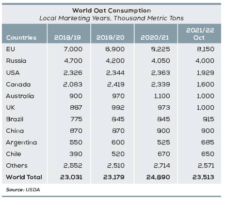 According to USDA data, oat consumption in the 2020/21 season is 8.2 million tons in the EU, 4 million tons in Russia, 2.3 million tons in the USA, 2.3 million tons in Canada, 1.1 million tons in Australia, and around 1 million tons in the United Kingdom. It is estimated that almost all of these countries will consume in similar rates (with some slight decline) in the 2021/22 season.