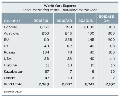 The ranking of leading countries in international oat trade has not changed much in the last few seasons. Canada, Australia, the EU, the United Kingdom and Russia lead the way in exports. It is estimated that Canada, which is estimated to have exported 2 million tons in the 2020/21 season, will experience a decline in exports in the current season and export 1.1 million tons in parallel with the expectations of a decrease in production. In the same period, it is forecast that Australia will export 600 thousand tons of oats, the EU will export 200 thousand tons, the United Kingdom will export 115 thousand tons and Russia will export 100 thousand tons of oats.