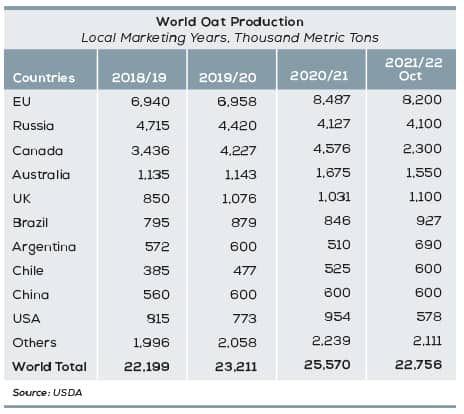 According to the data in the report entitled “Grain: World Markets and Trade Report” published by USDA in October 2021, world oat production, which was 22.1 million tons in 2018/19 season, reached 23.2 million tons in 2019/20 season and 25.5 million tons in 2020/21 season. However, it is noteworthy that there has been a significant decrease in oat production in the current 2021/22 season. The USDA data indicates that global oat production will decrease by 3 million tons and will be realized as 22.7 million tons. Drought in many regions around the world is thought to have an important impact on this decline.