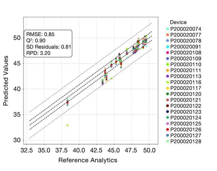 The spectrometer operates in the 1,300–2,350 nm wavelength range and uses specialized grating optics to enhance signal quality. This configuration ensures a high signal-to-noise ratio, contributing to reliable and repeatable measurements. The trinamiX PAL Two delivers robust performance for on-site analysis, prioritizing mobility, speed, and ease of use, making it an ideal complement to benchtop systems. An exemplary model for protein content in rapeseed and soya extraction meals demonstrates the small device to device deviation between 20 spectrometers. Predicted values closely match reference values, confirming the system’s reliability across multiple units (Figure 1).