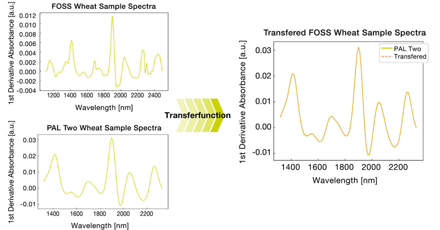 The transfer function compensates for differences in resolution and wavelength range, enabling a cost-effective and fast transition to mobile NIR. Based on an exemplary small data set measured with a benchtop spectrometer and the mobile spectrometers, a transfer function can be set up. This transfer function can translate an existing database of benchtop NIR spectra to trinamiX PAL Two spectra, circumventing the need to create a new database from scratch. In this way, already existing NIRS databases can be used to build calibrations for the mobile spectroscopy solution (Figure 2).