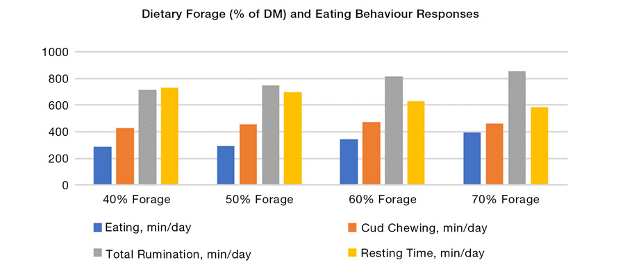 Recent research has shown an inverse relationship between time spent eating and resting. Long material, such as long dry hay, increases eating time but may reduce resting (lying) time – depending on the quality of the forage. Jiang et al., 2017 compared diets with increasing levels of forage – from 40% forage to 70% forage (Figure 1). As the forage content increased, peNDF (physically effective NDF) and uNDF240 (undigested NDF) levels also increased. Forages that are higher in NDF concentration or have longer particle size effectively lengthen the time required to consume feed. There was a significant increase in rumination time (eating and cud chewing) largely through an increase in eating time. This resulted in a decrease in resting time that reflected the increase in total rumination time (Figure 1).