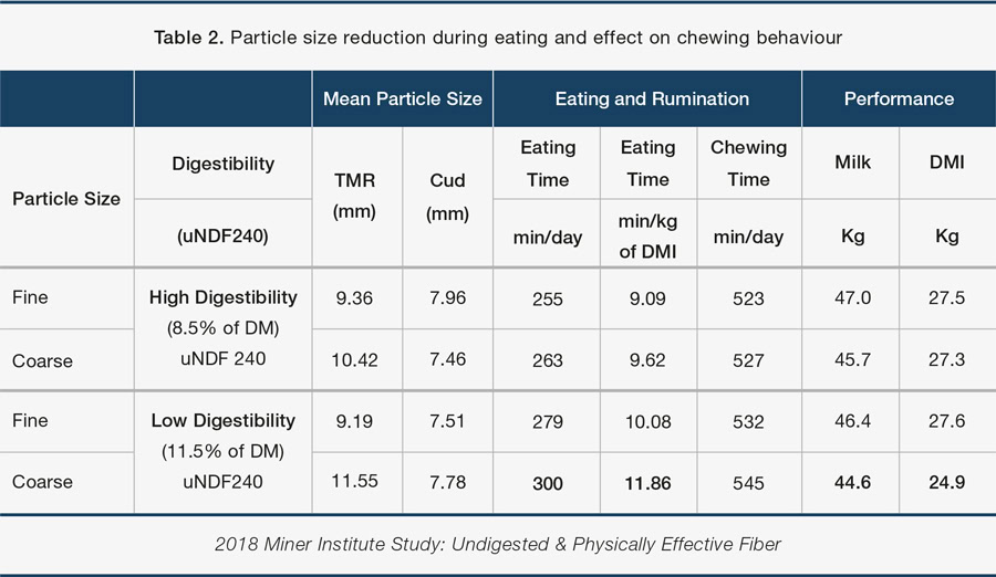 A study conducted at the Miner Institute examined the digestibility of the diet (uNDF240) and the physically effective fiber in the diet (peNDF and peuNDF240). The study examined four diets that contained the same amount of corn silage and chopped wheat straw. The particle size and uNDF240 content were adjusted using timothy hay at two chop lengths and some pelleted beet pulp to further reduce uNDF240. Table 2 shows that cows on the high digestibility/low effective fibre treatment had approximately 45 minutes less eating time but consumed over 2.26 kilograms more feed as compared to the low digestible/high effective fibre diet.