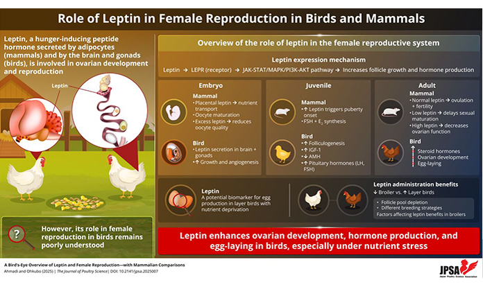 Researchers from Japan’s Ibaraki University reviewed leptin’s role in female bird reproduction, with mammalian comparisons. The study shows that leptin regulates ovarian development, follicle growth, and hormone production, improving egg-laying in layer birds while potentially causing premature follicle depletion in broiler birds, and highlights its potential as a biomarker for egg production.