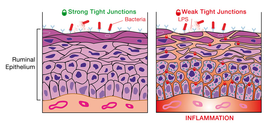On the other hand, tight junctions, which are a key component of the rumen epithelial barrier, are also disrupted, leading to increased permeability of the rumen epithelium. A compromised epithelial barrier, or leaky epithelium, of either the rumen or lower gut, results in bacteria translocation leading to excessive immune activation and inflammation (Figure 1).