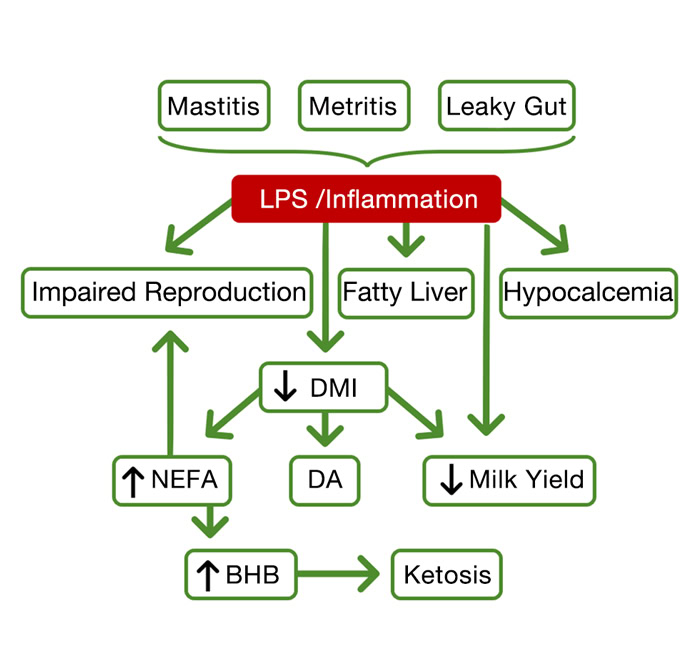 The use of glucose by the immune system and the reduction in feed intake are responsible for the increase in NEFA (non-esterified fatty acids) and ketones, explaining a decline in overall health, production, and reproduction outcomes.