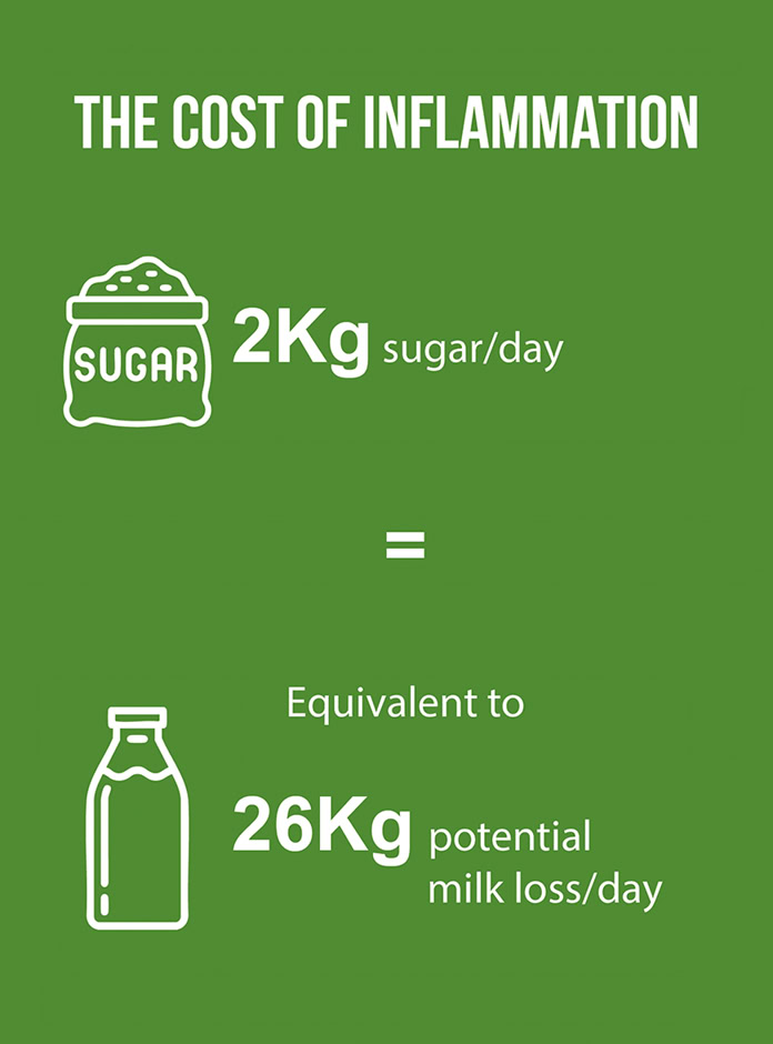 Recent studies show that the energy to fight against inflammation (modeled by LPS-induced infection) costs the equivalent of 2 kg of sugar every day and approximately 26 kg of milk loss.