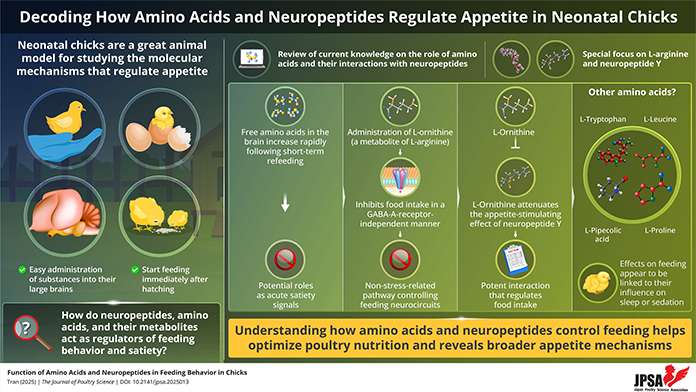 Dr. Phuong V. Tran from the Graduate School of Bioresource and Bioenvironmental Science, Kyushu University, Japan, analyzes current knowledge on the regulation of food intake in neonatal chicks in a review article published in Volume 62 of the Journal of Poultry Science on March 15, 2025. The review, titled “Function of Amino Acids and Neuropeptides in Feeding Behavior in Chicks”, focuses specifically on the role of amino acids and their metabolites and how they interact with the appetite-stimulating neuropeptide Y (NPY).