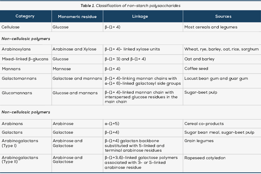 Non-starch polysaccharides are long polymeric carbohydrate chains containing up to several hundred thousand monomeric units, excluding α-glucans (starch). NSPs in aquaculture feeds are present as an integrated part of the cell wall (upto 90% NSPs) of plant ingredients and also in a purified soluble form, such as guar gum, to stabilise the pellet. The most abundant plant cell wall NSPs include cellulose, hemicellulose and pectins; while fructans (inulin), glucomannans and galactomannans are not so abundant as of those aforesaid and serves as the storage polysaccharides within the plants. Mucilages, alginates, exudate gums, β-glucans and various modified polysaccharides are other constituents of the NSPs.