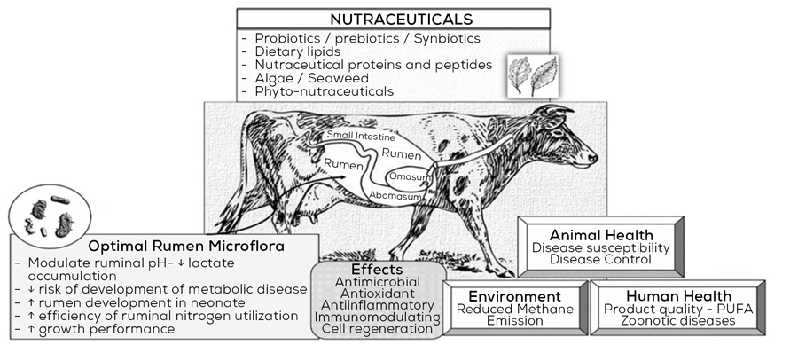Ruminant livestock production has an environmental impact, particularly through the emission of methane and the excretion of nitrogen in significant quantities, contributing to global methane emissions. Therefore, nutraceuticals not only play a vital role in ruminant health but also have the potential to influence public health by inhibiting methane emissions and reducing the presence of pathogenic bacteria in food products derived from animals.