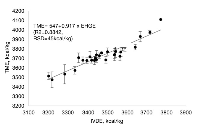 The crucial test for any in vitro system is whether its results align with in vivo trials. In a duck study with 30 corn samples, SDS III’s in vitro digestible energy showed strong correlation (R²=0.8842, RSD=45 kcal/kg) with true metabolizable energy. This correlation demonstrates SDS III’s reliability and its potential to replace many live-animal trials in feed evaluation (Figure 1).