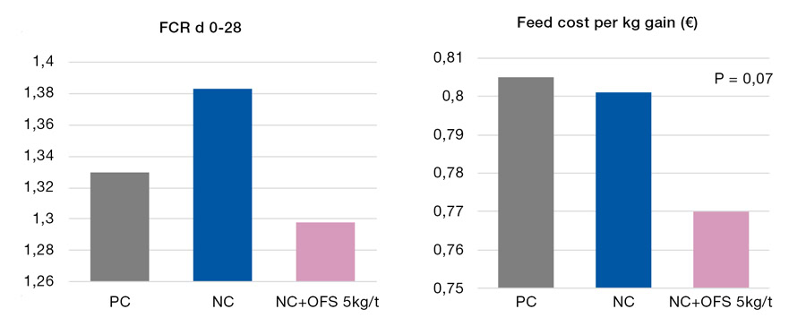 with conventional gut health additives, or a Negative Control (NC) with no gut health additives, or the NC with 5 kg/t OceanFeed™ Swine additive (NC + OFS 5 kg/t) from 0-28 days of age.